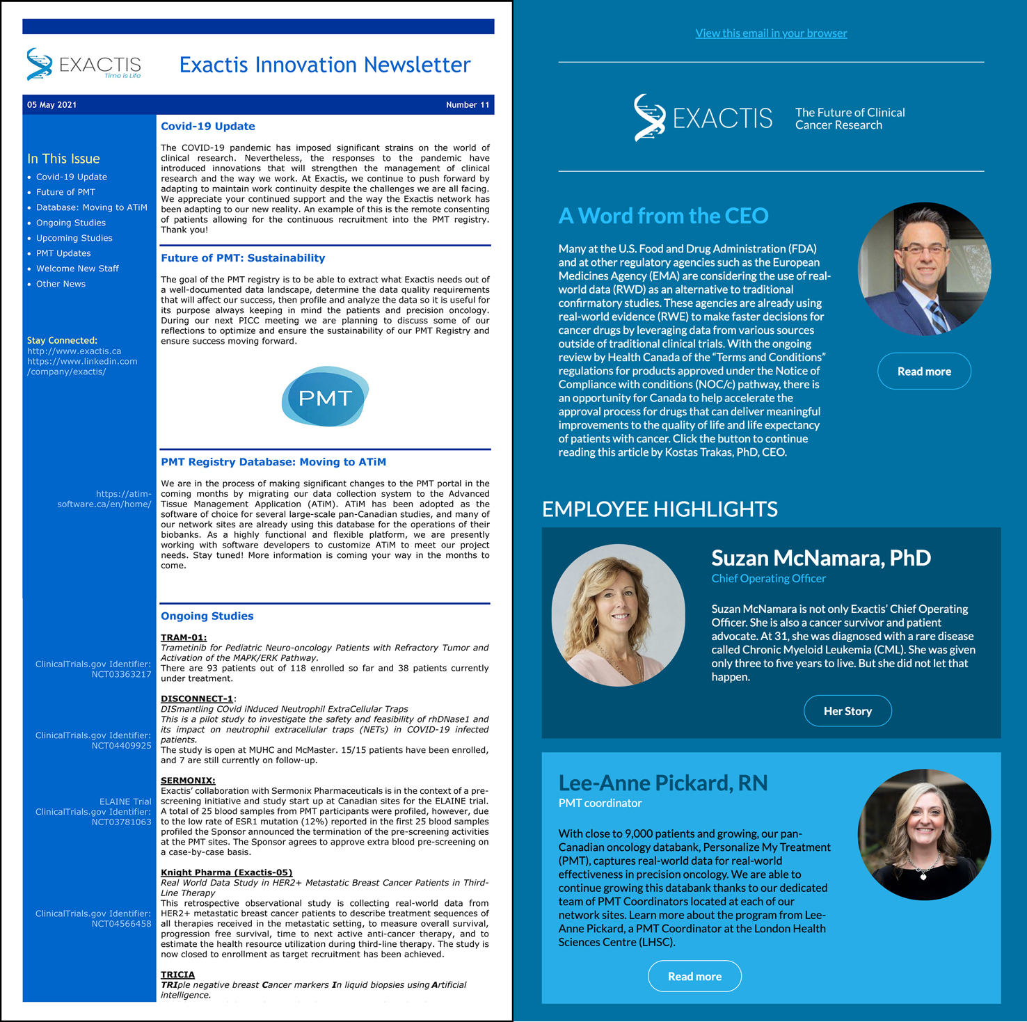Un changement qui a rapidement porté fruit a été d’améliorer l’apparence et la convivialité de son bulletin trimestriel. Phil a proposé de mettre en évidence les membres clés de l’équipe d’Exactis, de placer les histoires plus centrées sur l’humain en haut et le contenu plus scientifique et de niche en bas. Un soutien à la rédaction, à l’édition et au design, incluant un modèle de base personnalisé dans Mailchimp, a aidé Exactis à produire une infolettre attrayante et engageante. Les données le démontrent, le nombre total de clics pour les 3 articles vedettes a augmenté de 200 %! | |